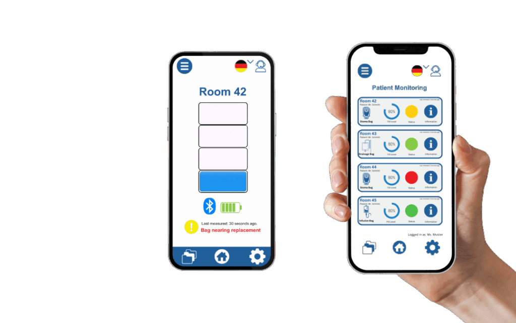Die zugehörige Anwendung visualisiert den Füllstand und stellt Ereignisse wie das Erreichen definierter Schwellenwerte strukturiert dar. Über Bluetooth Low Energy oder Gateways kann das System in bestehende IT Umgebungen integriert werden. Die Architektur ist darauf ausgelegt, datenschutzkonforme Szenarien in Pflege und Klinik zu unterstützen.